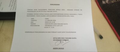 Hasil pantauan dan investigasi HarianBasi.com dan BarsakrimNews.id, pengumuman berupa surat yang ditandatangani oleh ketua BPD Desa Tanjung Gusta Akden Sagala hanya dimuat di status WhatsApp saja. Tidak ada pengumuman resmi di Kantor Desa Tanjung Gusta dan masing-masing dusun.