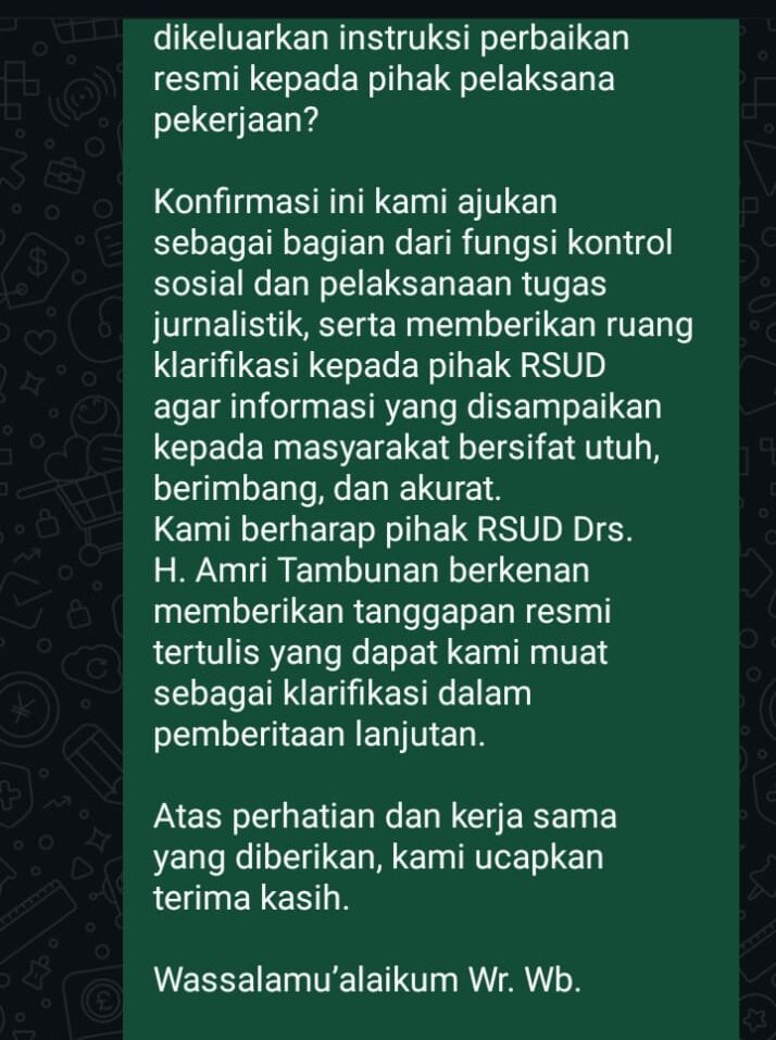 Sementara itu, upaya konfirmasi yang dilakukan rekan media kepada Direktur RSUD Drs. H. Amri Tambunan, dr. Erlinda Yani, MKM, melalui pesan WhatsApp pada Senin lalu (26/01/2026), hingga berita ini diturunkan belum mendapatkan tanggapan.