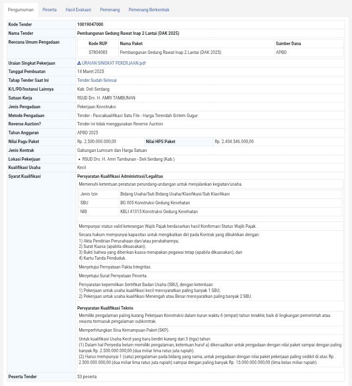 Gedung yang disorot merupakan bagian dari Proyek Dana Alokasi Khusus (DAK) Tahun Anggaran 2025 berupa pembangunan Gedung Rawat Inap 2 Lantai RSUD Drs. H. Amri Tambunan, dengan nilai anggaran kurang lebih sekitar Rp2,5 miliar, yang dikerjakan oleh CV. Maju Utama.