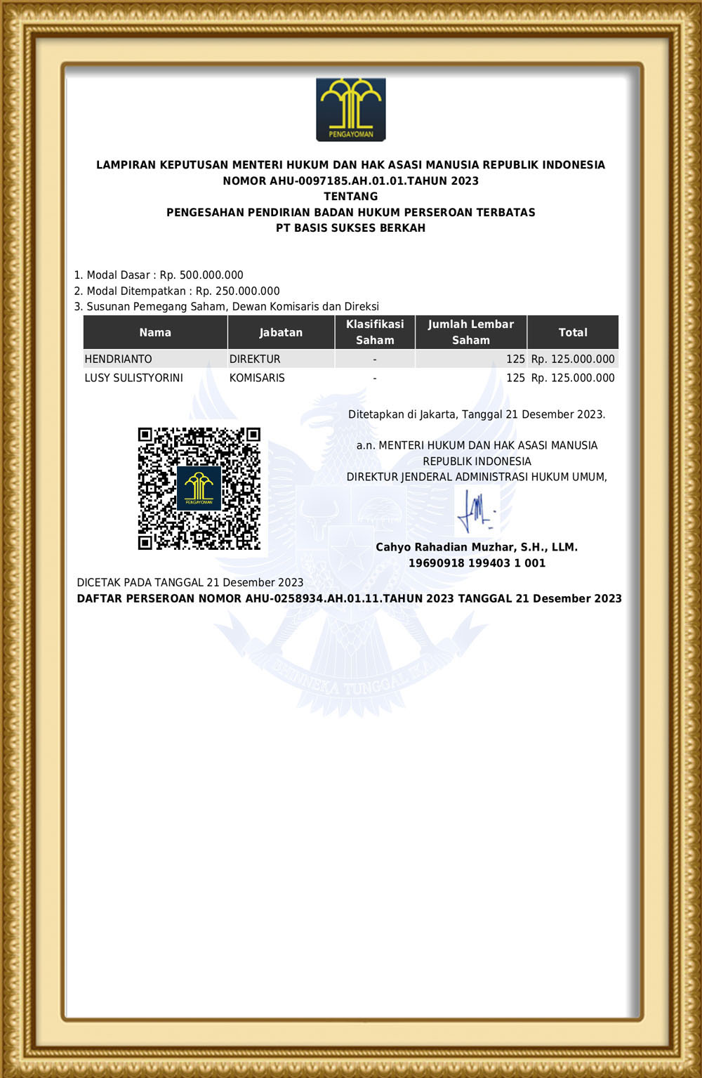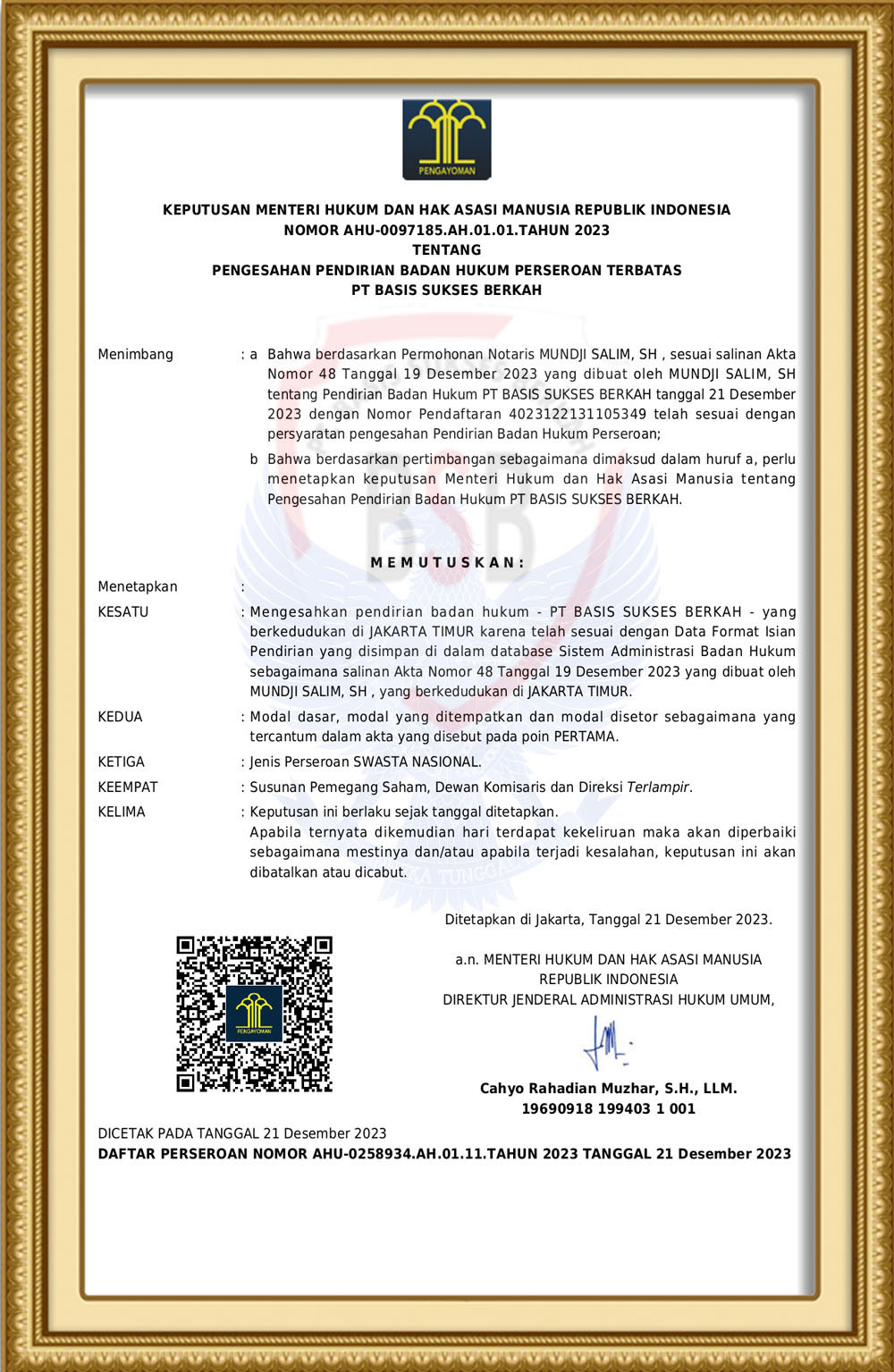 Keputusan Menteri Hukum dan Hak Asasi Manusia Republik Indonesia Nomor AHU-0097185.AH.01.01.Tahun 2023