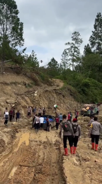 Perjalanan menuju Kecamatan Pining dihadapkan pada berbagai kendala, mulai dari jalan licin, lumpur tebal, hingga material banjir yang menutup hampir seluruh jalur. Di sejumlah titik, rombongan harus berhenti dan menunggu alat berat membuka jalan.